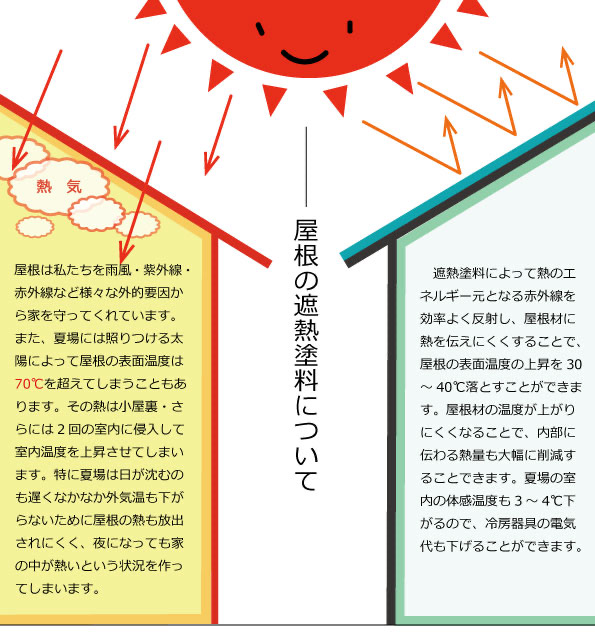 遮熱塗料によって熱のエネルギー元となる赤外線を効率よく反射し、屋根材に熱を伝えにくくすることで、屋根の表面温度の上昇を30~40°C落とすことができます。屋根材の温度が上がりにくくなることで、内部に伝わる熱量も大幅に削減することできます。夏場の室内の体感温度も3~4°C下がるので、冷房器具の電気代も下げることができます。